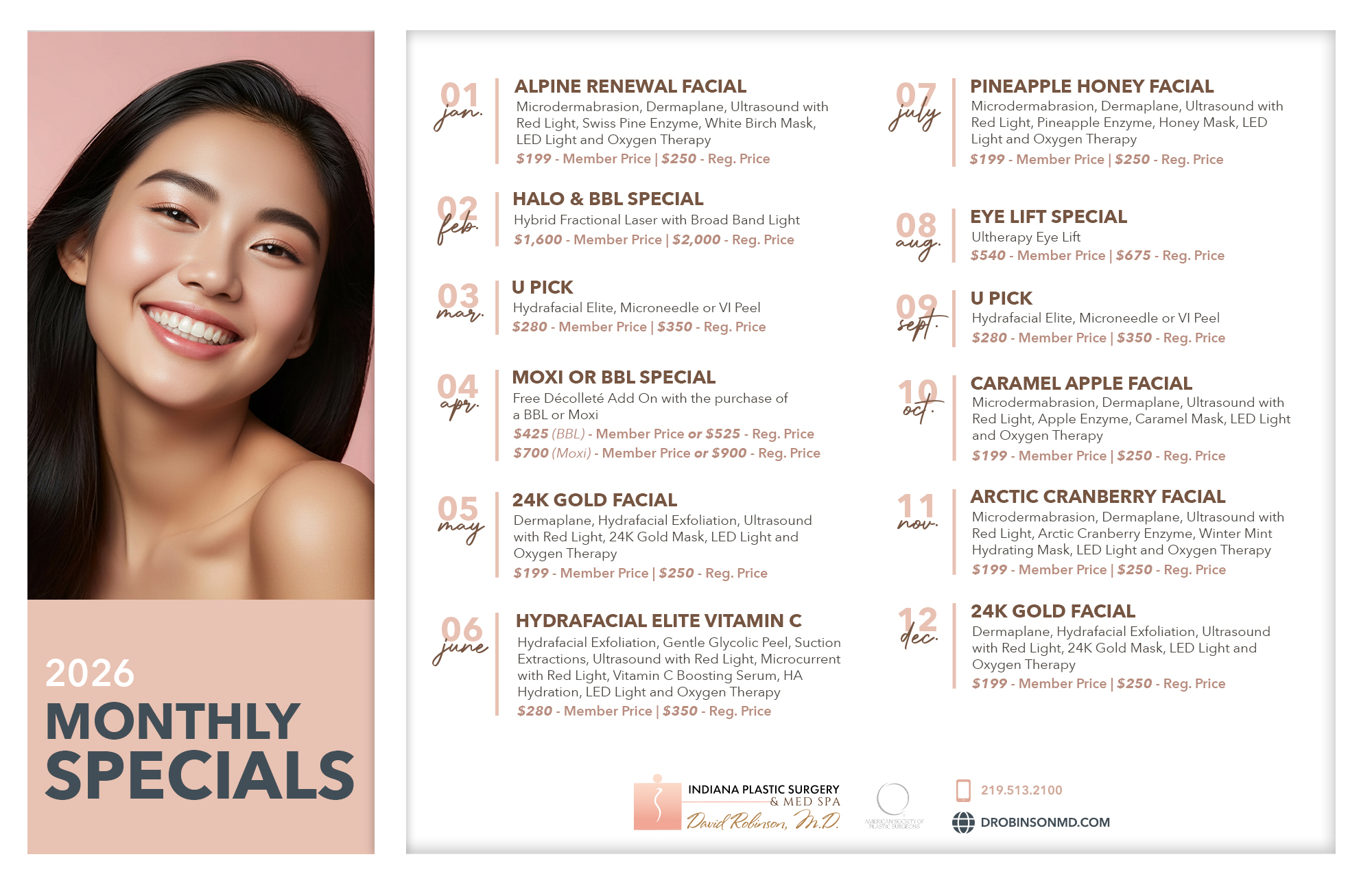 Visit our Facebook page and become a fan of Indiana Plastic Surgery for additional specials.